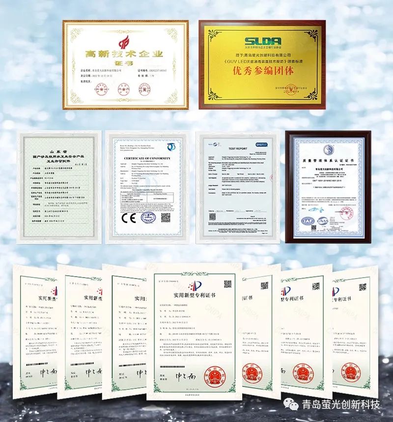 我司通過了高新技術(shù)企業(yè)、ISO9001管理體系認證,目前產(chǎn)品已經(jīng)通過CE、CQC、SGS、廣微所、無錫海關(guān)檢驗中心、CAN檢測中心等相關(guān)檢測機構(gòu)的認證,產(chǎn)品也符合RoHS指令以及Reach法規(guī), 公司目前已經(jīng)擁有超過50項國家專利,推出的過流式紫外LED殺菌器成為山東省首家獲得涉水衛(wèi)生許可批件的同類產(chǎn)品。