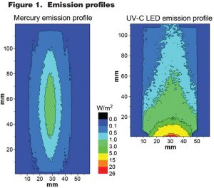 主要的設(shè)計(jì)挑戰(zhàn)是了解完全不同的光源,殺菌波長(zhǎng)略有不同。必須注意充分表征其穩(wěn)健性和可靠性,為這種設(shè)計(jì)轉(zhuǎn)變奠定基礎(chǔ)的一個(gè)關(guān)鍵是這兩種燈之間的發(fā)射曲線差異(圖 1)。僅從這張圖,就很容易看出需要改變 UV 反應(yīng)器設(shè)計(jì)的幾何形狀。汞燈需要圓柱形設(shè)計(jì),而 UVC LED 具有光發(fā)射曲線,可以使用但不需要圓柱形輪廓。除了具有根本不同的發(fā)射曲線外,還必須檢查 UVC LED 的光譜輸出。隨著低壓汞燈的普及,254 nm 已被認(rèn)為是理想的波長(zhǎng),盡管峰值殺菌效率介于 260 和 270 nm 之間,但具體還是取決于特定病原體。UVC LED 是準(zhǔn)單色的(大部分輸出落在 10 納米的間隙內(nèi)),但可以設(shè)計(jì)為殺菌范圍內(nèi)的各種波長(zhǎng),以針對(duì)特定病原體或一般峰值病原體紫外線敏感性。(例如,255、265、275 nm 等)。設(shè)計(jì)人員對(duì)波長(zhǎng)的選擇通常取決于成本、壽命、目標(biāo)病原體和紫外線強(qiáng)度輸出的組合。此外,由于缺乏使用這種新型創(chuàng)新光源的經(jīng)驗(yàn),制造商必須對(duì) UVC LED 進(jìn)行廣泛的預(yù)測(cè)試,以便對(duì)這些設(shè)備的耐用性和發(fā)射時(shí)間充滿信心,UVC LED 測(cè)量和測(cè)試設(shè)備對(duì)于產(chǎn)生這些重要數(shù)據(jù)至關(guān)重要。
