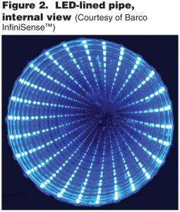 主要的設(shè)計(jì)挑戰(zhàn)是通過設(shè)計(jì)高效的紫外線反應(yīng)器來提高整體系統(tǒng)效率。由于燈發(fā)射曲線的差異,采用 LED 的處理室有可能與使用傳統(tǒng)汞燈的處理室大不相同。設(shè)計(jì)人員必須找到一種方法來有效地在反應(yīng)室內(nèi)分配這種新光源。目前,商用 UVC LED 的輸出功率低于 100 mW(對(duì)于單個(gè)設(shè)備,大約 3.5 mm 2) 與 17 瓦低壓汞燈(約 350 毫米 x 15 毫米)相比。盡管單個(gè) UVC LED 不如單個(gè)汞燈強(qiáng)大,但它們的 UVC 輸出和功率密度(每單位面積的輸出)在過去幾年中呈指數(shù)級(jí)增長(zhǎng)。因此,必須付出更多努力設(shè)計(jì)高效的紫外線反應(yīng)器,以補(bǔ)償和維持水處理系統(tǒng)的整體效率。一些設(shè)計(jì)可能很優(yōu)雅,例如在管道內(nèi)襯上 LED(如圖 2 所示),但整體效率必須是驅(qū)動(dòng)前提。一旦 UVC LED 技術(shù)成熟到可見光 LED 技術(shù)的水平并且非常高效,它們幾乎可以放置在任何配置中;但就目前而言,UVC LED 系統(tǒng)只有在圍繞極其高效的反應(yīng)器設(shè)計(jì)構(gòu)建時(shí)才能有效。目前只有少數(shù) UVC LED 處理系統(tǒng)可用,每個(gè)系統(tǒng)都有不同的反應(yīng)器設(shè)計(jì),高效的反應(yīng)器設(shè)計(jì)不容易發(fā)現(xiàn),開發(fā)團(tuán)隊(duì)花費(fèi)數(shù)年時(shí)間設(shè)計(jì)和驗(yàn)證比基于汞燈的系統(tǒng)更高效的新型反應(yīng)器配置。先進(jìn)的建模工具,例如計(jì)算流體動(dòng)力學(xué)和有限元分析,與物理測(cè)量技術(shù)(例如生物劑量學(xué)和光度計(jì))一起部署。