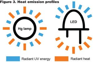 主要的設(shè)計(jì)挑戰(zhàn)是管理 UVC LED 發(fā)出的熱量以確保燈的長(zhǎng)壽命?;?LED 的系統(tǒng)的主要優(yōu)勢(shì)之一是它們不會(huì)將熱量傳遞到水中(圖 3)。LED 在設(shè)備的前表面發(fā)出所有光,在后表面發(fā)出熱量,而汞燈則通過同一表面發(fā)出光和熱;UVC LED 比基于汞的燈發(fā)出更多的熱量,而后者必須正確管理。這可以通過多種方式完成,并將有助于延長(zhǎng)系統(tǒng)的使用壽命,需要新的技能或?qū)<也拍苡行У赝瓿蛇@項(xiàng)任務(wù)。如果 LED 保持高溫,則 LED 的紫外線輸出會(huì)減少,并且系統(tǒng)的消毒效率會(huì)隨著時(shí)間的推移而降低。實(shí)施熱減熱技術(shù)和熱量監(jiān)測(cè)是維持長(zhǎng)效 UV LED 的關(guān)鍵。根據(jù)使用情況,與傳統(tǒng)汞燈的年度更換要求相比,這些燈的更換間隔可為幾年。