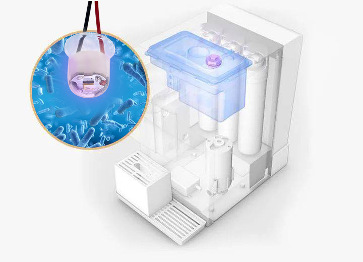 UVC LED水殺菌技術(shù)根據(jù)場(chǎng)景不同,分為靜態(tài)水與動(dòng)態(tài)水殺菌兩大類(lèi)別。靜態(tài)水抑菌模塊是以水箱凈水殺菌應(yīng)用為主,一般安裝在飲水機(jī)、加濕器、咖啡機(jī)等設(shè)備的儲(chǔ)水箱中,紫光在設(shè)定時(shí)間內(nèi)循環(huán)照射水體,達(dá)到抑制細(xì)菌滋生的效果。